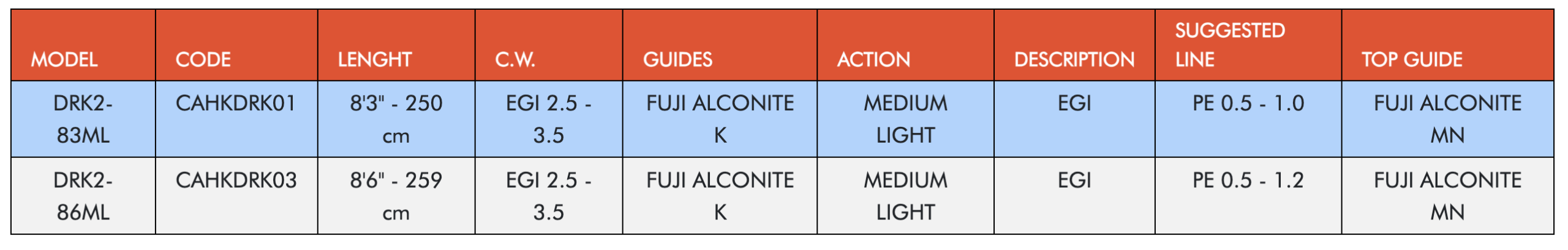 Disponible en dos medidas —83ML y 86ML—, la Squid Dark DRK2 presenta una acción equilibrada que permite detectar las picadas más sutiles y manejar con precisión los egis y señuelos de calamar y sepia. Su blank de carbono de alto módulo proporciona una excelente respuesta y recuperación, mientras que su empuñadura ergonómica asegura comodidad durante largas jornadas de pesca.